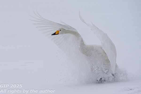 Blythe, Sue, Isle of Man, Whooper swan landing on snow -